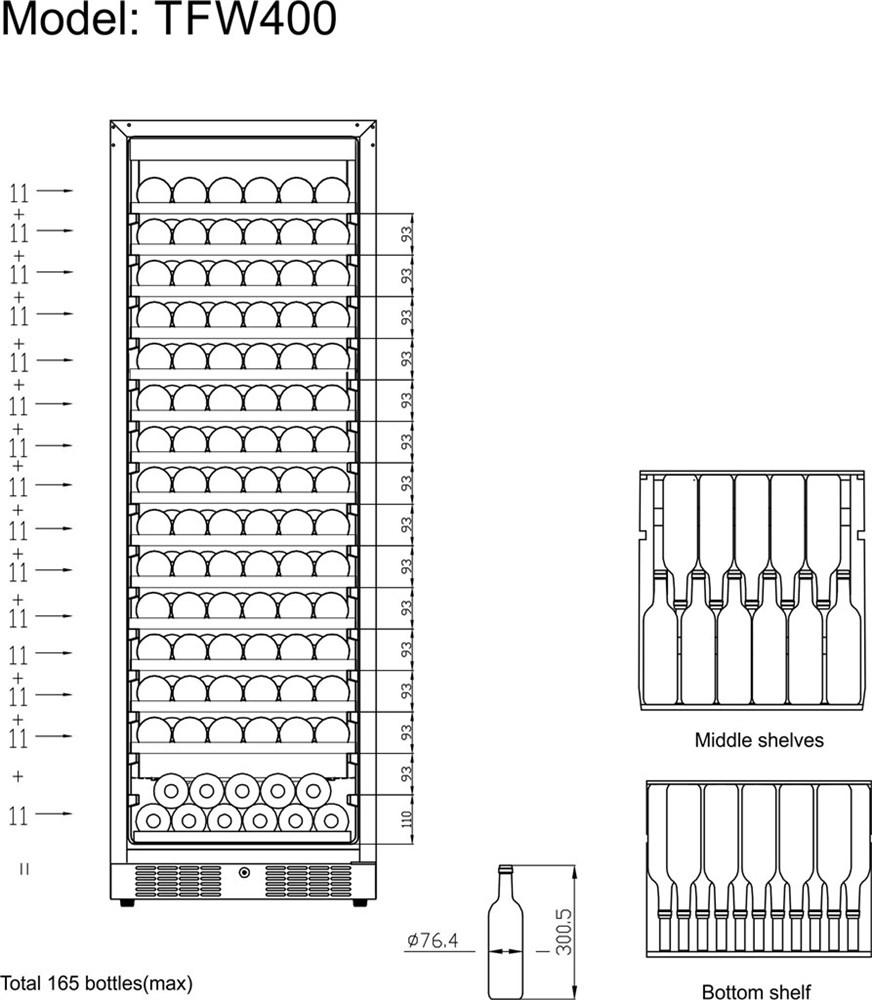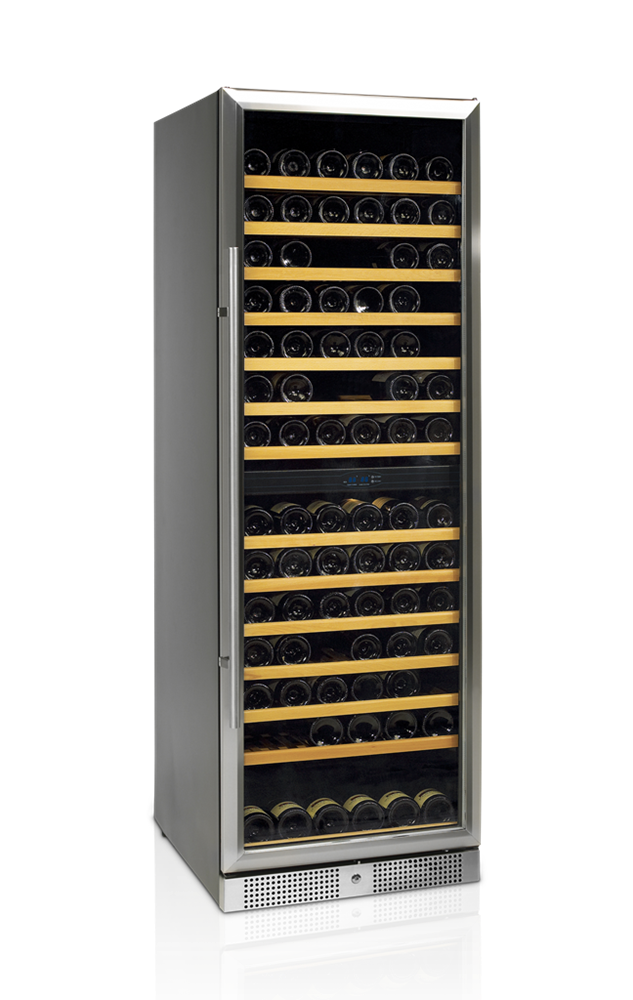 Chladiaca skriňa na víno dverová, nový dizajn, nerezový rám dverí a kľučka, obojstranné výklopné sklenené dvere so zámkom, LED vnútorné osvetlenie, drevené police, prezentačné police sú k dispozícii ako voliteľné príslušenstvo, antivibračný chladiaci systém, ventilované chladenie, automatické odmrazovanie, elektronický termostat, digitálne ovládanie, model S - 1 teplotná zóna a model 2S - 2 teplotné zóny, 4 nastaviteľné nožičky.
